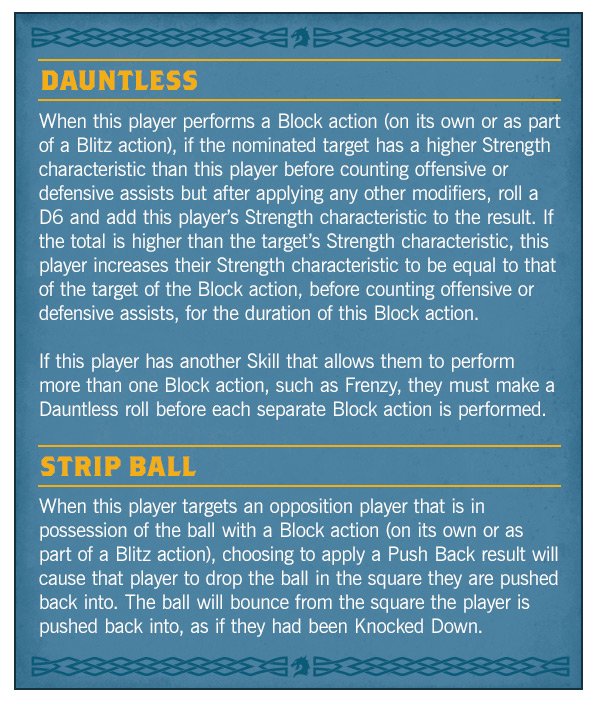 They’re also useful on defence with Dauntless , which allows them to take on opposing players with a higher Strength, and Strip Ball , which forces your opponent to drop the ball when the Valkyrie gets the Push Back result in a Block roll. Blitz the ball carrier, and then grab it for yourself before they even know what’s hit them.