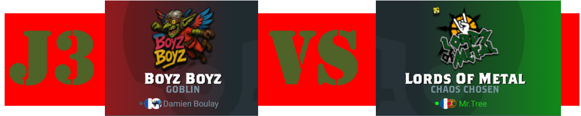 -Salut à vous Bob! Aujourd’hui on suit le match de J3 des Lords of Metal, les Elus du Chaos de Mr.Tree face à la franchise gobeline de Vacheatuba, les Boyz Boyz.